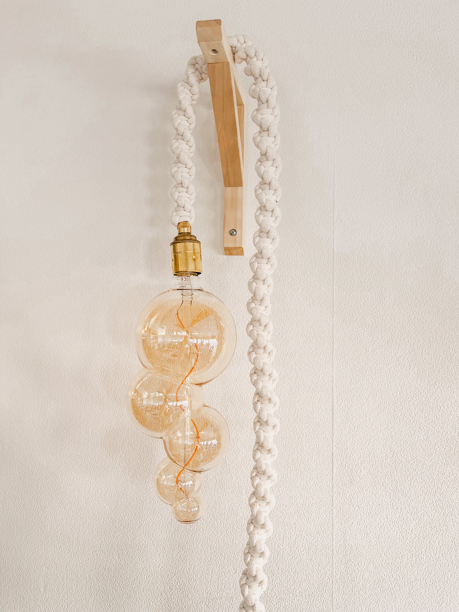 Really cool macrame rope light. Perfect to bring some boho vibes in your room. It's made of recycled cotton yarn. This macrame rope light is complete with a very unique bobble light and wooden wall hook. It's my favourite rope light with a beautiful brass fitting and eco-friendly rope in the colour natural white.